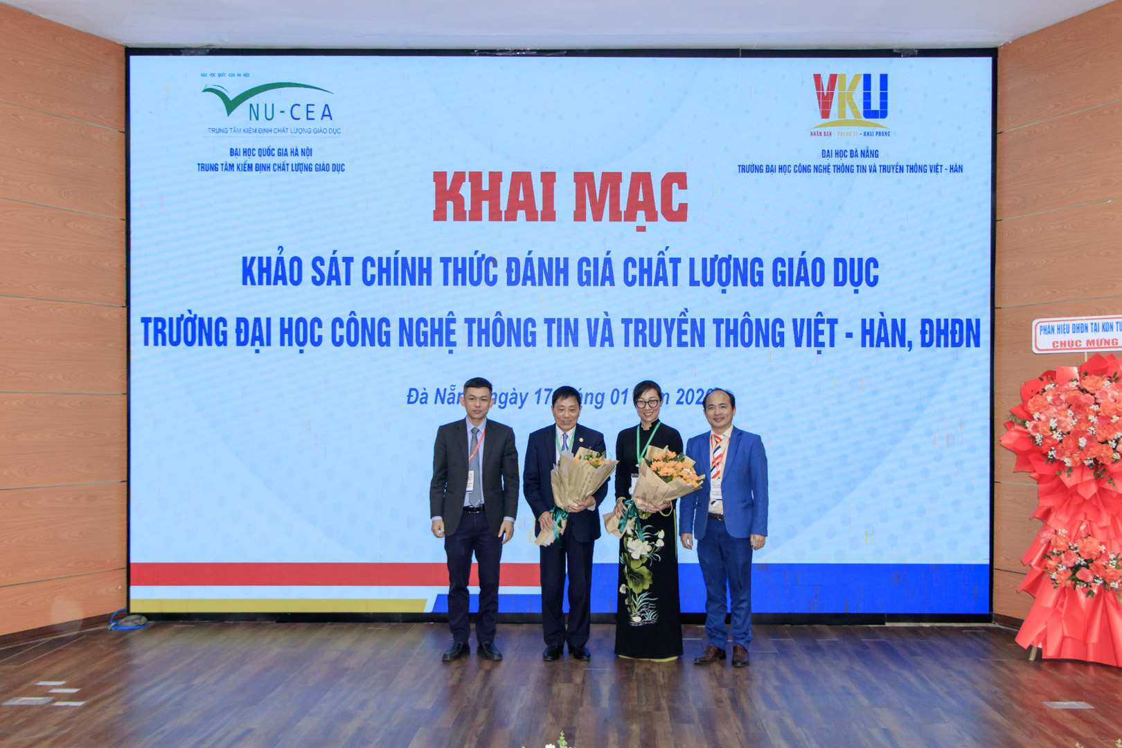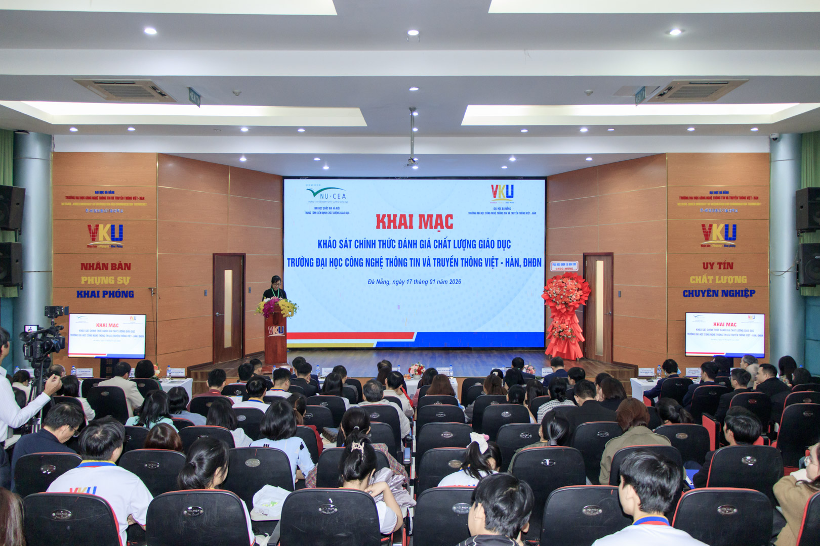 Sáng ngày 17/01/2026, Trường Đại học Công nghệ Thông tin và Truyền thông Việt – Hàn (VKU), Đại học Đà Nẵng đã long trọng tổ chức Khai mạc Khảo sát chính thức đánh giá chất lượng giáo dục Nhà trường, phối hợp cùng Trung tâm Kiểm định chất lượng giáo dục – Đại học Quốc gia Hà Nội (ĐHQGHN). Đây là sự kiện có ý nghĩa quan trọng, đánh dấu bước phát triển mới của VKU trong lộ trình bảo đảm và nâng cao chất lượng giáo dục theo chuẩn mực quốc gia.Toàn cảnh lễ khai mạcTham dự Khai mạc, về phía Trung tâm Kiểm định chất lượng giáo dục – ĐHQGHN có PGS.TS. Tạ Thị Thu Hiền – Giám đốc Trung tâm; Đoàn đánh giá ngoài có GS.TS. Mai Trọng Nhuận – Trưởng đoàn đánh giá, TS. Nguyễn Thị Thu Hương – Thư ký, cùng các thành viên Đoàn đánh giá gồm: PGS.TS. Đinh Văn Toàn, PGS.TS. Lê Thái Hưng, GS.TS. Phạm Thành Huy, PGS.TS. Lê Thị Thu Thủy, PGS.TS. Ngô Văn Thuyên và ThS. Vũ Thị Mai Anh – Giám sát viên. Về phía Đại học Đà Nẵng có PGS.TS. Lê Thành Bắc – Phó Giám đốc, Đại diện Lãnh đạo các Ban chức năng thuộc ĐHĐN, Đại diện Lãnh đạo các Trường Đại học thành viên. Về phía VKU, PGS.TS. Huỳnh Công Pháp – Hiệu trưởng Nhà trường, Chủ tịch Hội đồng tự đánh giá, cùng các thành viên gồm: PGS.TS. Nguyễn Thanh Bình-Bí thư Đảng ủy, TS. Huỳnh Ngọc Thọ – Phó Hiệu trưởng, Lãnh đạo các đơn vị thuộc Trường; cùng toàn thể đội ngũ cán bộ, giảng viên, viên chức và sinh viên Nhà trường.PGS.TS. Huỳnh Công Pháp – Hiệu trưởng VKU phát biểuPhát biểu tại buổi Khai mạc, PGS.TS. Huỳnh Công Pháp – Hiệu trưởng Nhà trường nhấn mạnh, việc tổ chức đánh giá chất lượng giáo dục không chỉ là yêu cầu bắt buộc theo quy định, mà còn là hành động cụ thể nhằm triển khai Nghị quyết số 71-NQ/TW của Bộ Chính trị và Kết luận số 45-KL/TW của Ban Chỉ đạo Trung ương về đổi mới sáng tạo và khoa học, công nghệ, trong đó khẳng định vai trò then chốt của giáo dục đại học đối với phát triển khoa học – công nghệ, đổi mới sáng tạo và chuyển đổi số quốc gia. VKU xác định bảo đảm và nâng cao chất lượng giáo dục là nền tảng cốt lõi để đào tạo nguồn nhân lực chất lượng cao trong các lĩnh vực công nghệ mũi nhọn, góp phần thực hiện hiệu quả các chủ trương, định hướng lớn của Đảng và Nhà nước. Trên tinh thần đó, Nhà trường đã triển khai công tác tự đánh giá một cách nghiêm túc, bài bản và đồng bộ, với sự tham gia trách nhiệm của toàn thể hệ thống chính trị, cán bộ, giảng viên và viên chức. Đồng thời, bày tỏ mong muốn Đoàn chuyên gia đánh giá ngoài sẽ có những nhận định khách quan, khuyến nghị xác đáng, góp phần hỗ trợ VKU tiếp tục hoàn thiện hệ thống bảo đảm chất lượng, nâng cao năng lực quản trị và phát triển bền vững trong giai đoạn tới.PGS.TS. Tạ Thị Thu Hiền – Giám đốc VNU-CEA phát biểu khai mạcĐại diện VNU-CEA, PGS.TS. Tạ Thị Thu Hiền – Giám đốc Trung tâm phát biểu khẳng định ý nghĩa và vai trò của đợt khảo sát chính thức trong quy trình đánh giá chất lượng giáo dục cơ sở giáo dục đại học. Đoàn chuyên gia đánh giá ngoài sẽ làm việc với tinh thần khách quan, độc lập, minh bạch, tuân thủ đầy đủ các quy định, tiêu chuẩn và quy trình kiểm định; đồng thời ghi nhận và đánh giá cao sự chuẩn bị nghiêm túc, chu đáo của VKU cho đợt khảo sát này.PGS.TS. Lê Thành Bắc – Phó Giám đốc Đại học Đà Nẵng phát biểu chúc mừngPhát biểu chúc mừng, PGS.TS. Lê Thành Bắc – Phó Giám đốc Đại học Đà Nẵng ghi nhận và đánh giá cao sự nỗ lực, quyết tâm của VKU trong công tác tự đánh giá và chuẩn bị nghiêm túc cho đợt Khảo sát chính thức đánh giá chất lượng giáo dục. Đồng chí khẳng định, dù là một trường đại học thành viên trẻ, VKU đã có bước phát triển nhanh, rõ nét và đúng định hướng, đặc biệt trong các lĩnh vực công nghệ số, trí tuệ nhân tạo, thiết kế vi mạch bán dẫn và đổi mới sáng tạo. Đại học Đà Nẵng luôn quan tâm, chỉ đạo và tạo điều kiện để VKU phát huy thế mạnh, xây dựng mô hình đại học ứng dụng – nghiên cứu, gắn kết chặt chẽ với doanh nghiệp và hội nhập quốc tế; đồng thời bày tỏ tin tưởng đợt khảo sát chính thức sẽ mang lại những đánh giá khách quan, góp phần giúp Nhà trường tiếp tục hoàn thiện hệ thống bảo đảm chất lượng và phát triển bền vững trong giai đoạn tiếp theo.